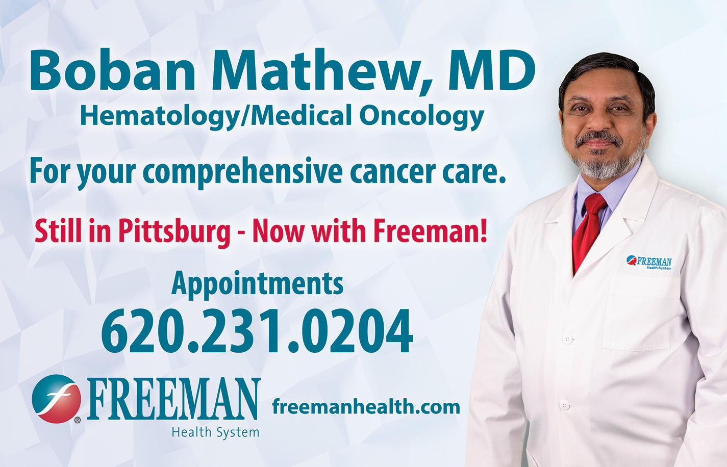 To make an appointment with Dr. Mathew, call the Freeman Physician Group of Pittsburg - Oncology Services at 620.231.0204. Referrals are not required.